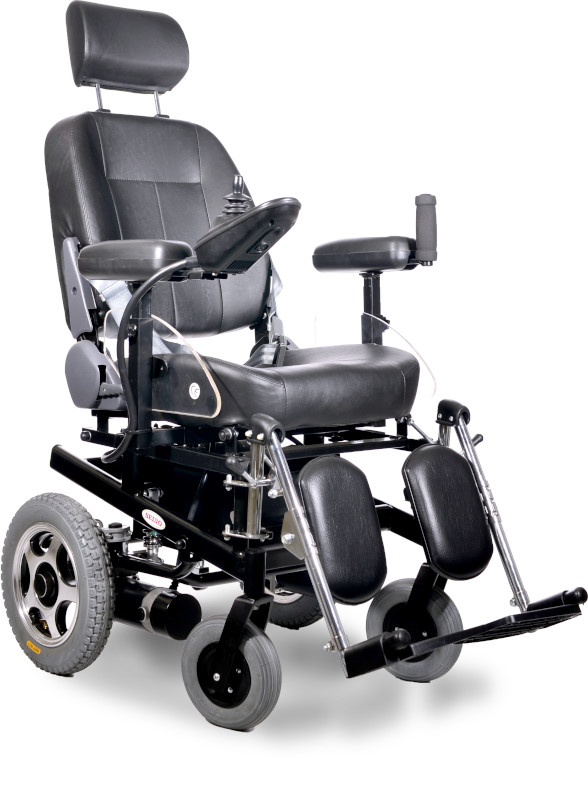 Elektrický polohovatelný invalidní vozík Selvo s opěrkou hlavy a s možností nastavení ovládání vozíku na obě strany. U vozíku lze ručně nastavit polohu zádové opěrky a polohu stupaček.