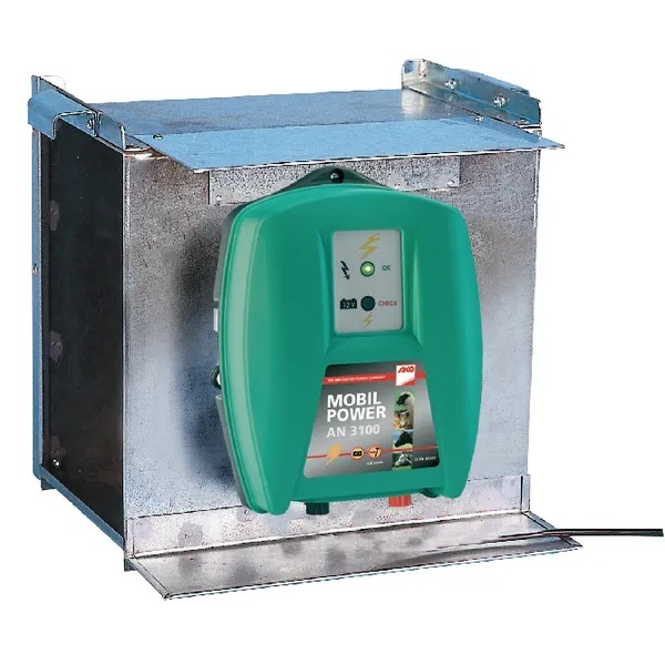 Ochranná skříň na uložení akumulátorové zdroje mobilního ohradníku 12 V (9 V). Skříň má možnost upevnění zdroje ohradníku a solárního modulu. Maximální rozměry zdroje 36,5 x 11 x 37 cm, max. rozměry baterie 36 x 21 x 32 cm.