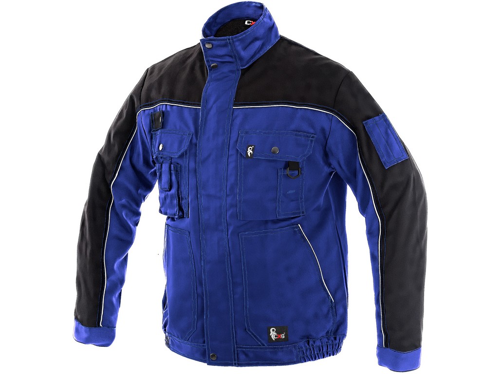 Pánská montérková blůza CXS, modro-černá, norma: EN ISO 13688, rukávy s nastavitelnou manžetou, na levém rukávu kapsička na tužky, kryté zapínání na zip a na druky, multifunkční náprsní kapsy, boční kapsy, pas na bocích do gumy, reflexní doplňky.