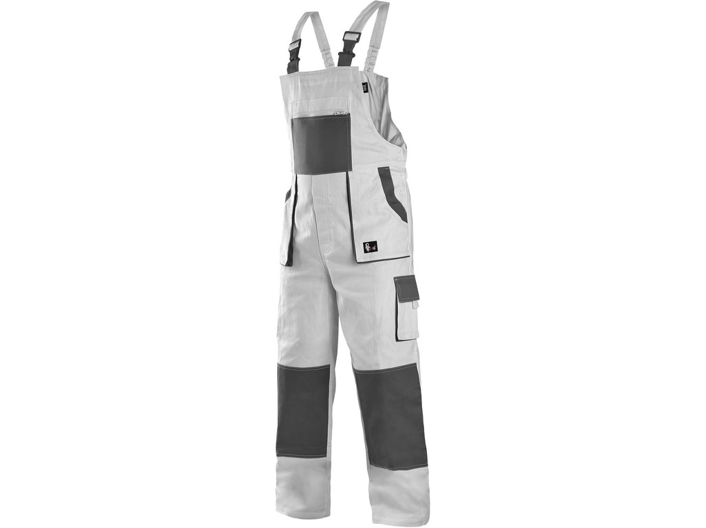 Pánské kalhoty s laclem CXS LUXY Robin, barva bílo-šedé, kalhoty s náprsenkou, zdvojená kolena, přední našité kapsy, náprsní kapsa na zip, boční kapsy na metr a na mobil, pas v zadní části do gumy.