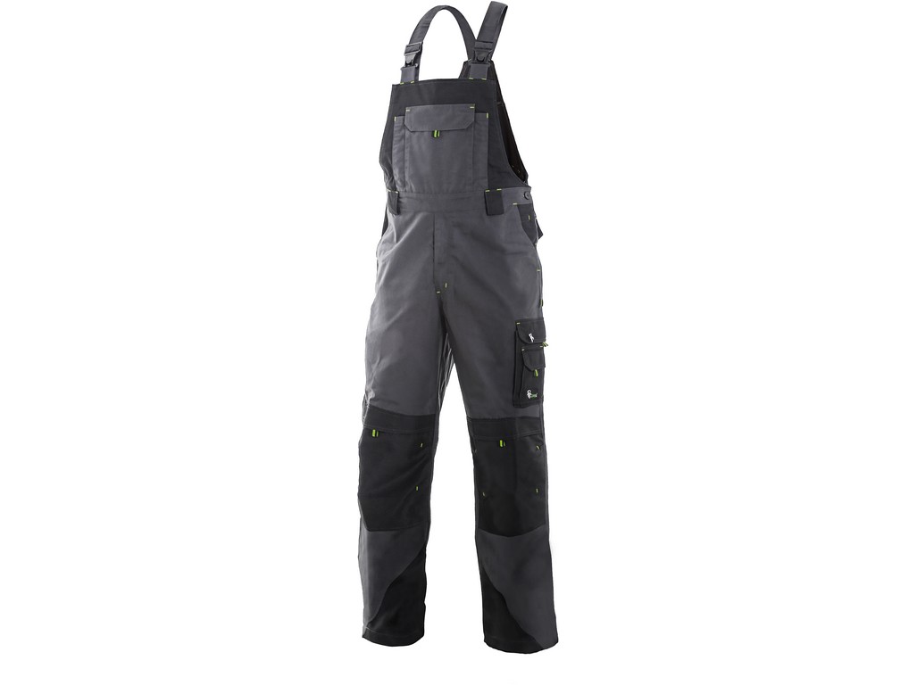 Pánské montérkové kalhoty s náprsenkou CXS, šedo-černo-zelené, norma: EN ISO 13688, zesílená kolena s možností vložení kolenních výztuh, pevný pás s poutky na opasek, přední klínové kapsy