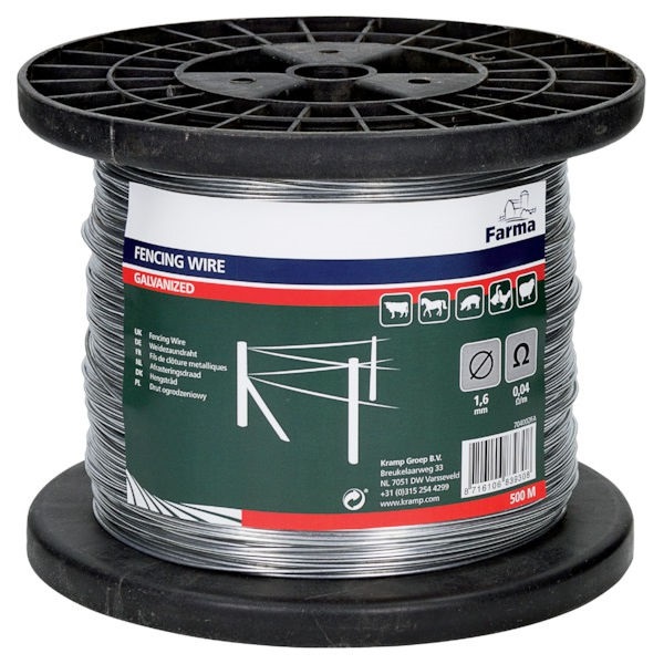 Ocelové pozinkované plotové lanko pro stavbu elektrických ohradníků. Délka 500 metrů, drát o průměru 1,6 mm.