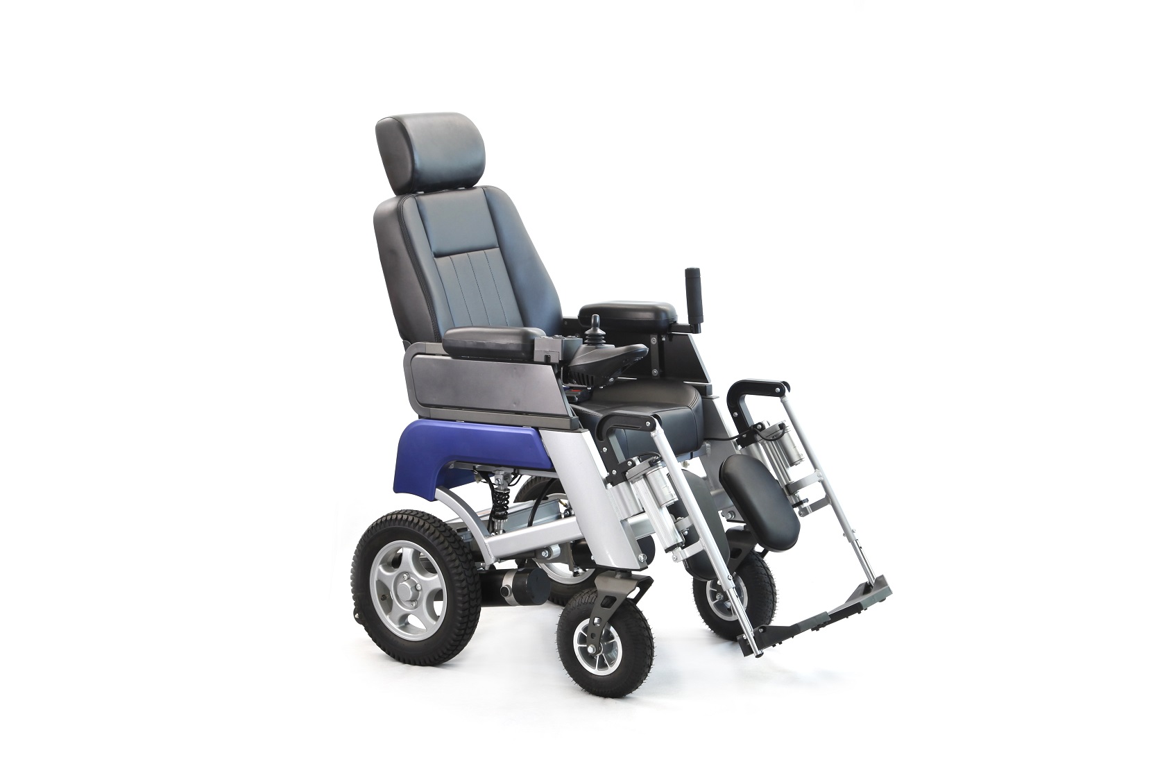 | Funkce: | Elektrické naklápění zádového opěradla a opěrek nohou, odpružení zadních kol, nastavitelná výška koleček proti překlopení, bezpečnostní pás |