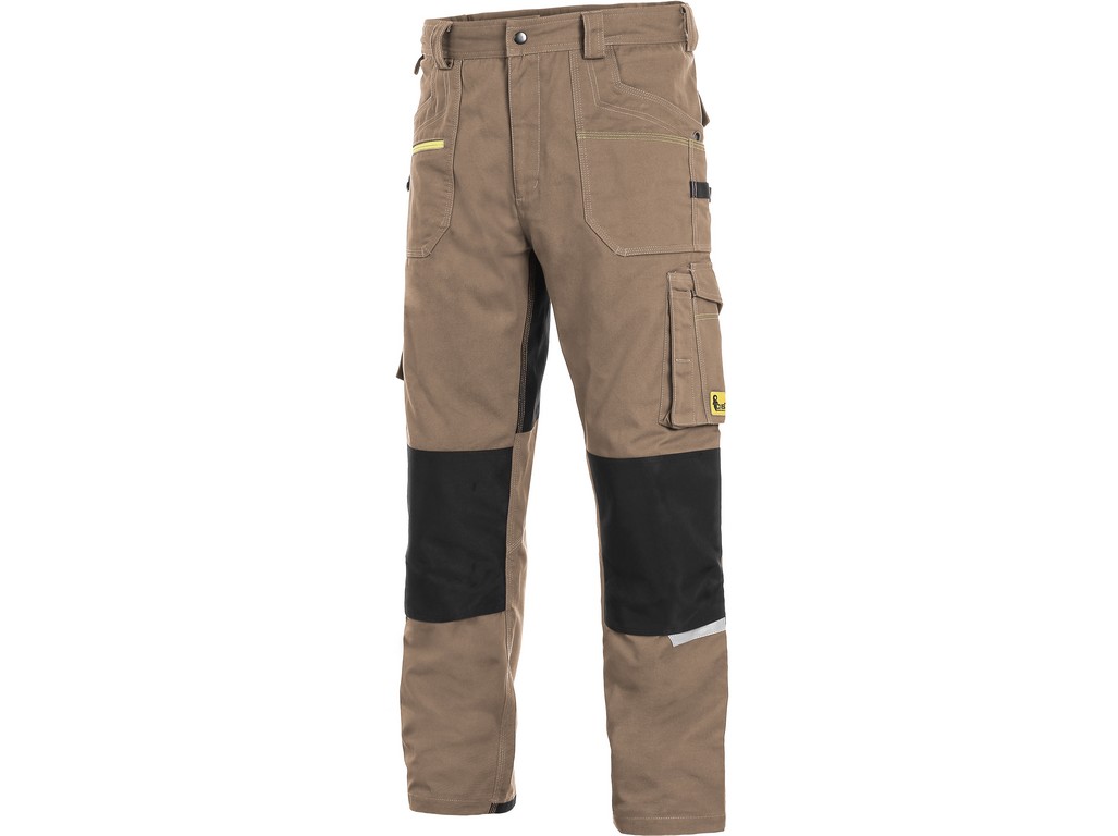 Pánské strečové montérkové kalhoty CXS béžovo-černé, norma: EN ISO 13688, strečová tkanina umožňující volný pohyb, pas s poutky na opasek, přední kapsy s kapsou na zip, multifunkční kapsy na obou stranách, kolena zesílena 600D polyesterem s možností vložení kolenních výztuh, dvě zadní kapsy - jedna s klopou, zadní spodní lem nohavice vyztužen 600D polyesterem, reflexní doplňky.